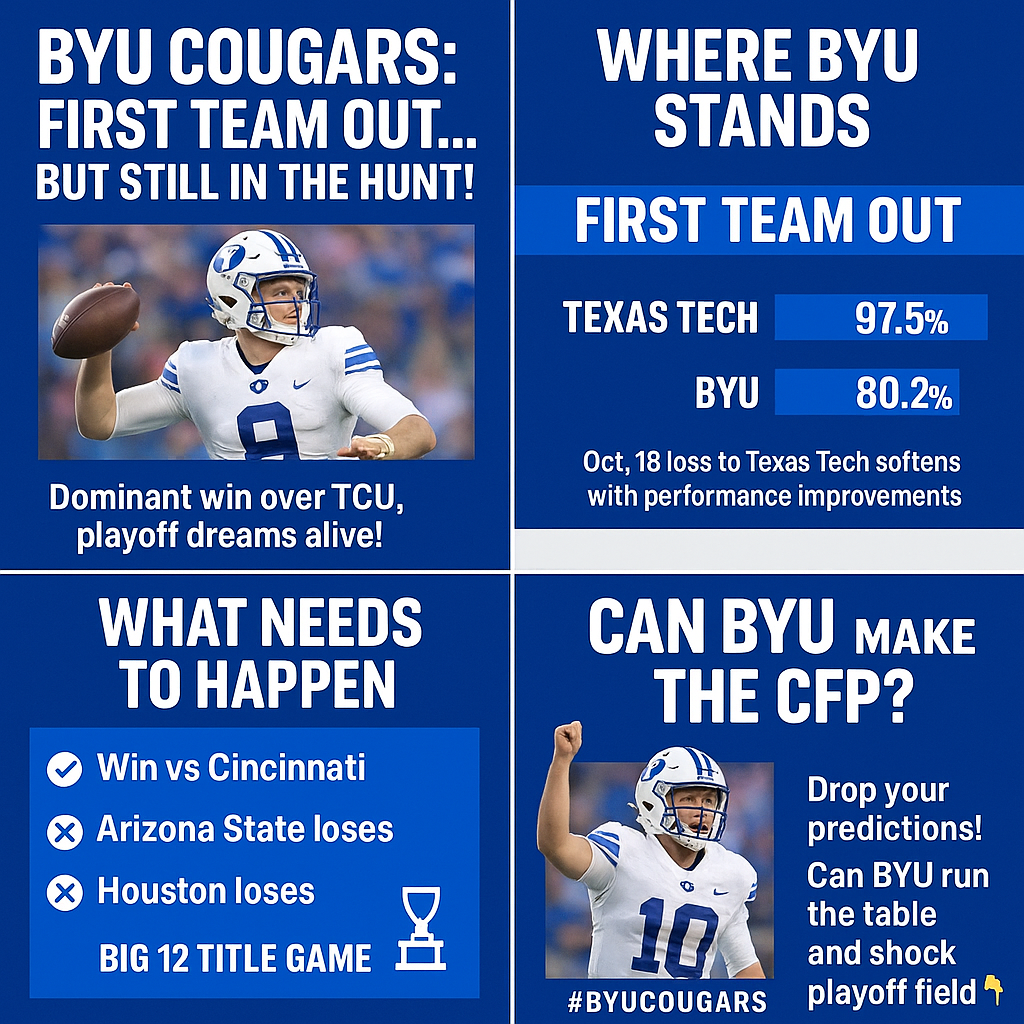 As the 2025 college football season barrels toward its final weeks, the BYU Cougars are one of the most compelling stories in the College Football Playoff (CFP) conversation. After a dominant Saturday win against TCU, the Cougars demonstrated the talent, grit, and championship potential that could have vaulted them into the playoff conversation. Yet despite this impressive performance, BYU remains the first team out of the CFP picture for now, a victim of the playoff format that prioritizes conference champions and top-ranked teams.